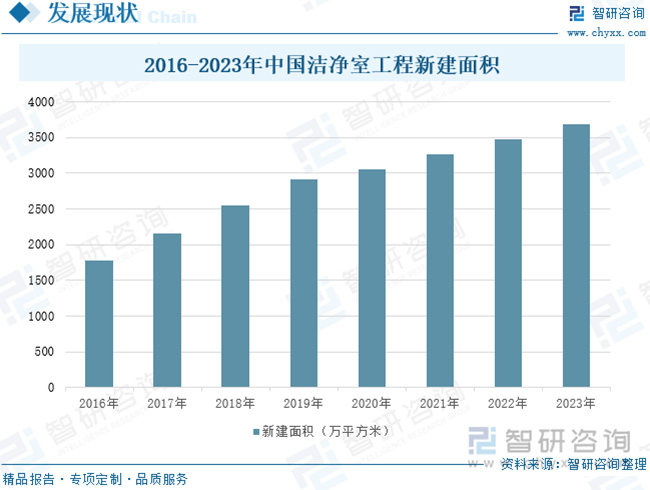 目前,全球半導體、光電等電子信息產(chǎn)業(yè)在世界范圍內(nèi)轉(zhuǎn)移,東亞、東南亞等地區(qū)已成為世界電子信息行業(yè)的主要市場和發(fā)展重心;同時由于我國醫(yī)藥衛(wèi)生、半導體、航空航天等事業(yè)的不斷發(fā)展,加速推動了潔凈室的市場化需求,從而帶動我國潔凈室工程產(chǎn)業(yè)的快速發(fā)展。2023年,中國潔凈室工程新建面積達3689萬平方米,同比增長6.04%。