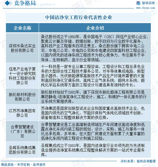 超潔凈環(huán)境控制又融合了風險評估、生產(chǎn)認證的概念和程序,加之潔凈技術(shù)跨行業(yè)、跨專業(yè)、跨學科的特點,使得潔凈室工程的難度和復雜性增加。因此對于潔凈室工程行業(yè)來說,優(yōu)化設(shè)計、現(xiàn)場施工環(huán)境的協(xié)調(diào)與管控、工程相關(guān)技術(shù)細節(jié)的經(jīng)驗積累,對客戶需求的理解和實現(xiàn),以及對設(shè)計變更的準備和響應(yīng)程度等都是衡量潔凈室工程企業(yè)競爭能力的重要指標。?目前,我國潔凈室工程行業(yè)競爭較為激烈,企業(yè)數(shù)量較多。其中,桑達股份、十一科技、蘇凈集團、新綸新材、柏誠股份、亞翔集成等設(shè)計研究院或建設(shè)承包企業(yè)在降低建造成本、提高潔凈室的穩(wěn)定性等方面占據(jù)優(yōu)勢,能提供高端潔凈室系統(tǒng)集成解決方案,位居行業(yè)領(lǐng)先地位。同時,行業(yè)內(nèi)還存在大量規(guī)模較小、技術(shù)水平與綜合解決方案能力有限的潔凈室工程企業(yè),普遍集中在對潔凈等級要求不高的低端市場。