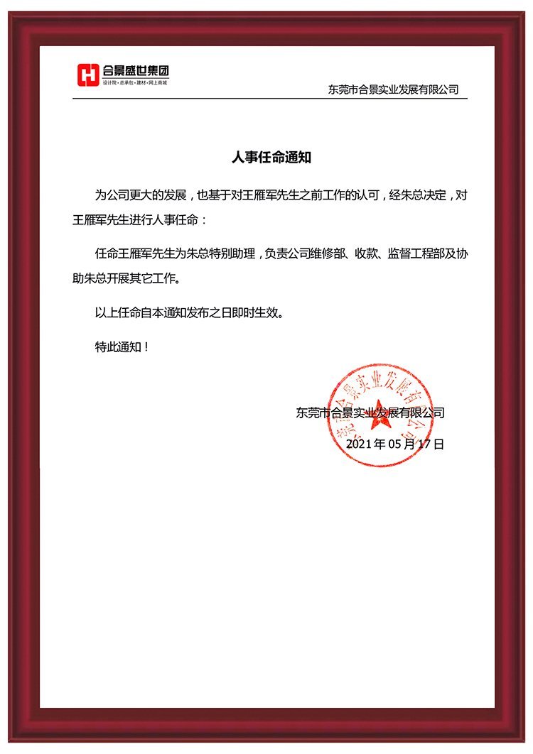 為推動公司更大發(fā)展,經(jīng)公司綜合評估,王雁軍先生將擔(dān)任朱總特別助理,負責(zé)公司維修部、收款、監(jiān)理部及協(xié)助總經(jīng)理開展其他工作。