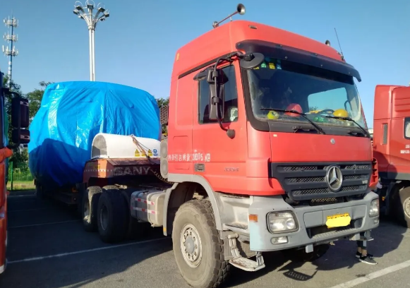近日,商車邦在北京某地遇到了4輛大件車,一輛奔馳Actros540馬力6x6牽引車,已經(jīng)裝載了一臺(tái)風(fēng)力發(fā)電主機(jī);3輛陜汽德龍6x4牽引車,正在等待裝貨。