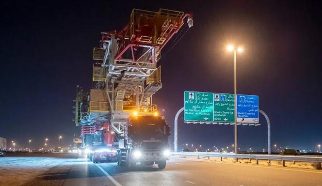 運(yùn)輸前需要進(jìn)行的準(zhǔn)備工作包括對(duì)道路基礎(chǔ)設(shè)施進(jìn)行改造,臨時(shí)替換100多個(gè)路燈和交通信號(hào)燈,建造臨時(shí)橋梁以保護(hù)地下電纜和管道。每個(gè)鉆機(jī)包括三個(gè)主要部分和三個(gè)較小的部分,重量從147噸到471噸不等。它們?cè)诮茇惏⒗镒杂蓞^(qū)的制造廠用大件運(yùn)輸車(chē)運(yùn)輸至杰貝阿里港,然后在港口裝載到Mammoet駁船上,再通過(guò)水路運(yùn)輸?shù)桨⒙?。最后在杜克姆港接收并裝載進(jìn)行陸運(yùn),鉆機(jī)段被運(yùn)送到Nimr現(xiàn)場(chǎng)400公里。