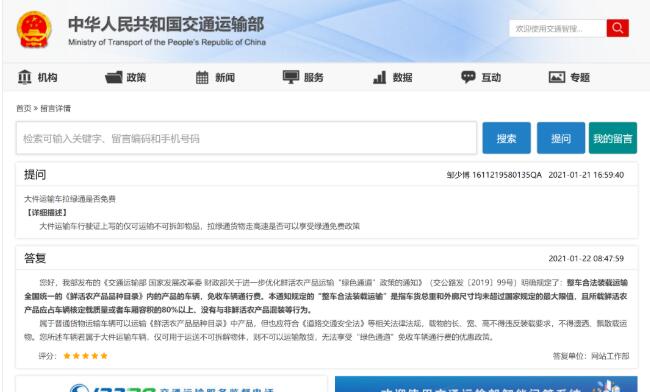交通運輸部官方網(wǎng)站在留言咨詢欄,對該問題進行了答復(fù)。