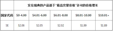 針對每個配送國家/地區(qū),允許的價格增長如下列表格所示。