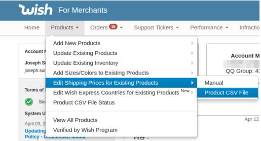 若要通過CSV更新促銷產(chǎn)品的“國際運費”,請打開”產(chǎn)品> 為現(xiàn)有產(chǎn)品編輯運費> CSV文件”。根據(jù)前文的指導(dǎo),您可以在此上傳“.csv文件”為您的促銷產(chǎn)品更新運費。