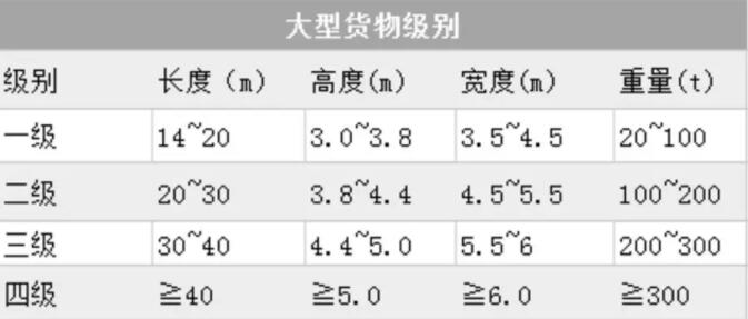 事實上,也不是隨便一個東西都能被稱為大件貨的,根據國家規(guī)定,長度在14米以上、寬度在3.5米以上、高度在3米以上的貨物,或是重量在20噸以上的單件及不可解體的成組(捆)貨物才能叫大件貨物。大件貨物又根據外形和尺寸重量分為四級,詳情如下圖所示: