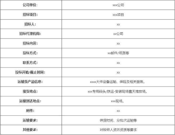 廣告和邀請函的內(nèi)容大體相同,主要包括:運輸方的單位名稱、地址;發(fā)運物件名稱;招標(biāo)的有關(guān)信息(招標(biāo)文件號或名稱,所運物件的參數(shù)說明,運輸?shù)奶厥庖?,運輸?shù)钠鹗嫉睾湍康牡?,運輸時間);招標(biāo)文件的價格、以及開始出售招標(biāo)文件的時間;報送投標(biāo)書時間、地點,及投標(biāo)截止期限;投標(biāo)保證金金額;對投標(biāo)人的資格要求。
